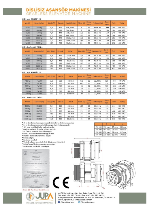Jupa Asansör’ün dişlisiz asansör makineleri üretiminde uyguladığı kalite ve güvenlik standartları doğrultusunda belgelendirilmiştir. Ürünlerimiz, ilgili yönetmelik ve teknik kriterlere uygun olarak test edilmiş ve sertifikalandırılmıştır.
